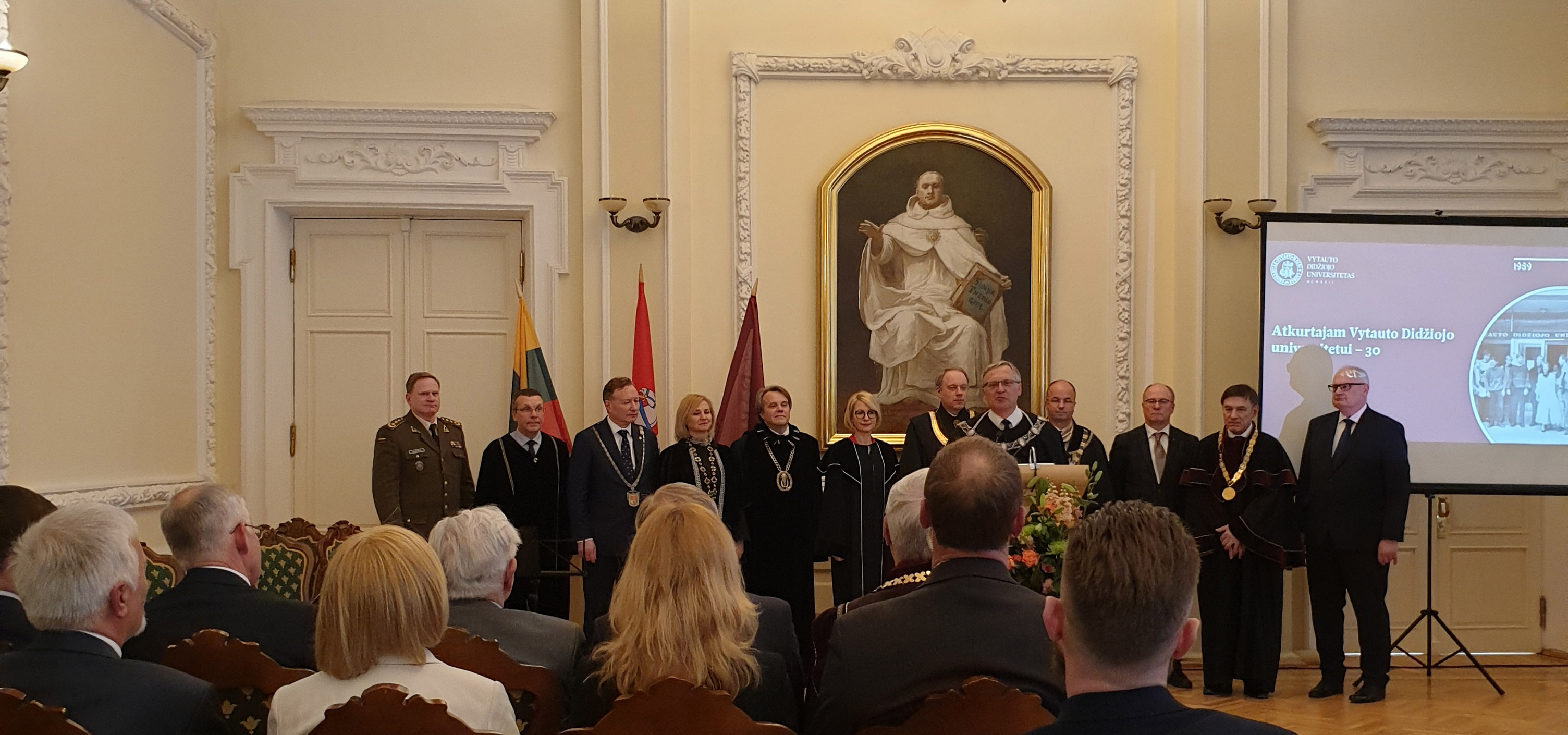 Lietuvos Rektorių konferencijos prezidentas prof. Artūras. Žukauskas sveikina VDU atkūrimo 30 m. paminėjimo iškilmėse kartu su Lietuvos universitetų Rektoriais.